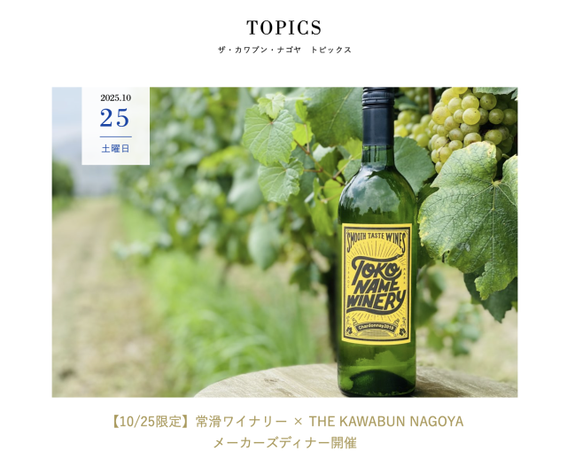 400年の歴史と伝統を持つTHE KAWABUN NAGOYA様にて、常滑ワイナリーのメイカーズディナーが開催されます!